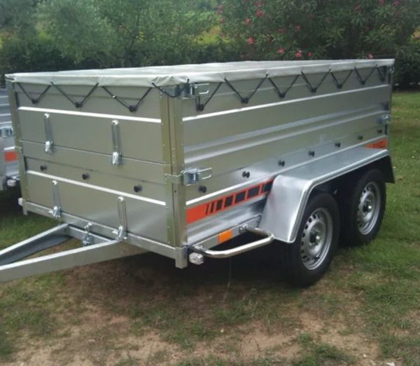 El precio original era: 1.250,00 €.999,99 €El precio actual es: 999,99 €. IVA INCLUIDORemolque de dos ejes con lona azul, paneles laterales adicionales y rueda jockey